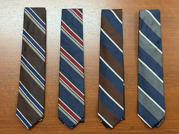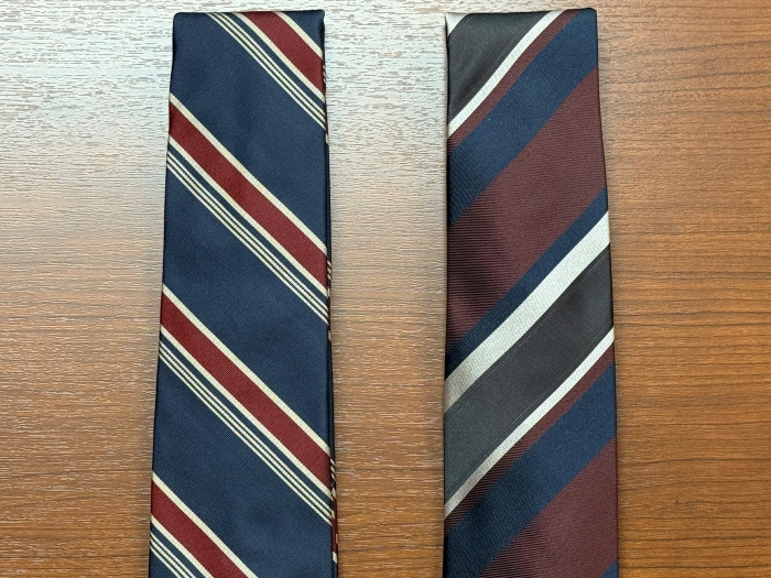 諸説ありますが、左上がりのストライプタイは、とあるアメリカブランドが発祥とされています。独自性を出すためなど理由は様々言われていますが、確かなのはアメリカものの全てが左上がりではないということです。一般的には右上がりのストライプタイが主流ですが、アメトラテイストのコーディネートには左上がりをチョイスしたいところ。