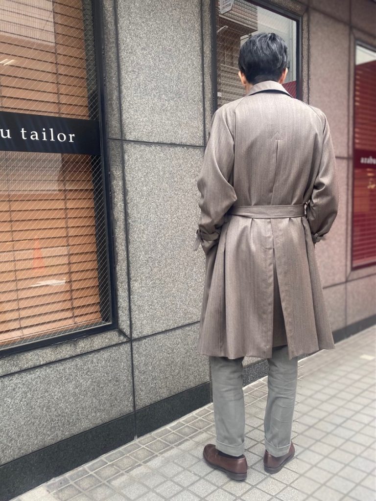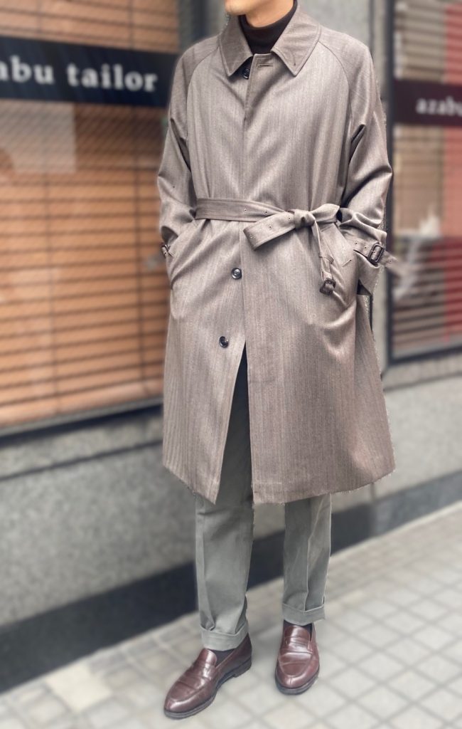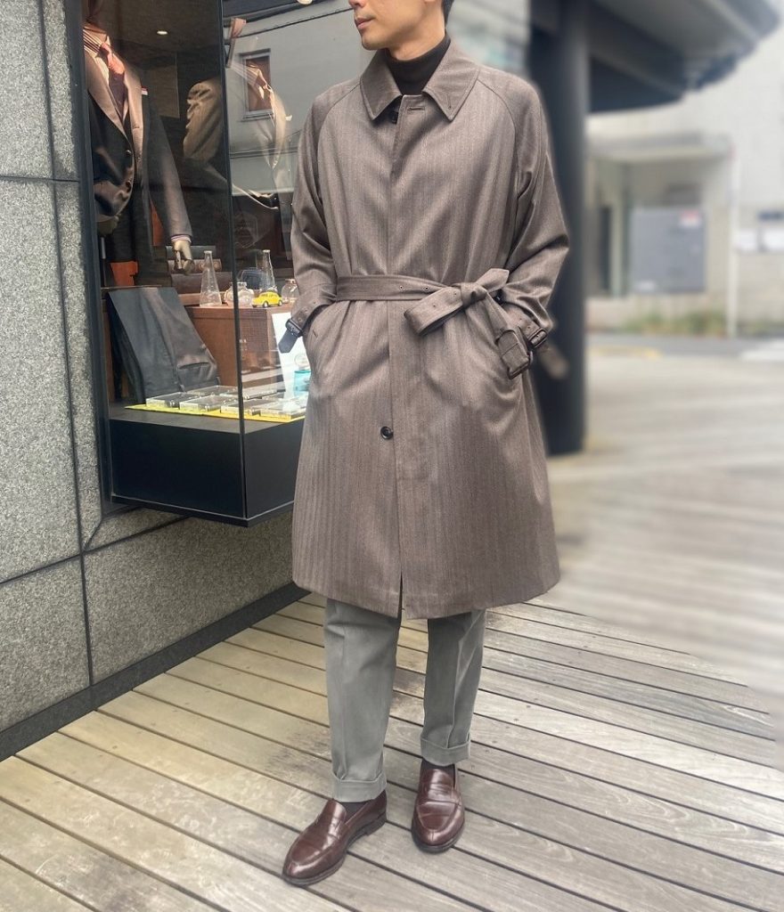 麻布テーラーの提案するニュートレンチコートは装飾を削ぎ、シンプルで都会的な表情に仕上がっています。