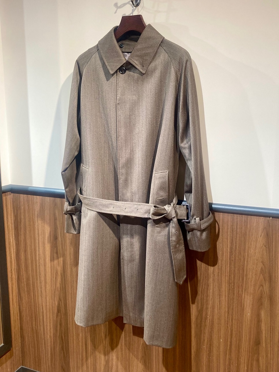 麻布テーラーの提案するニュートレンチコートは装飾を削ぎ、シンプルで都会的な表情に仕上がっています。