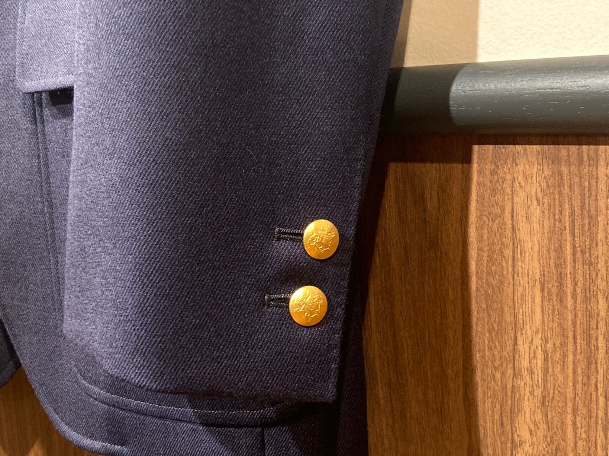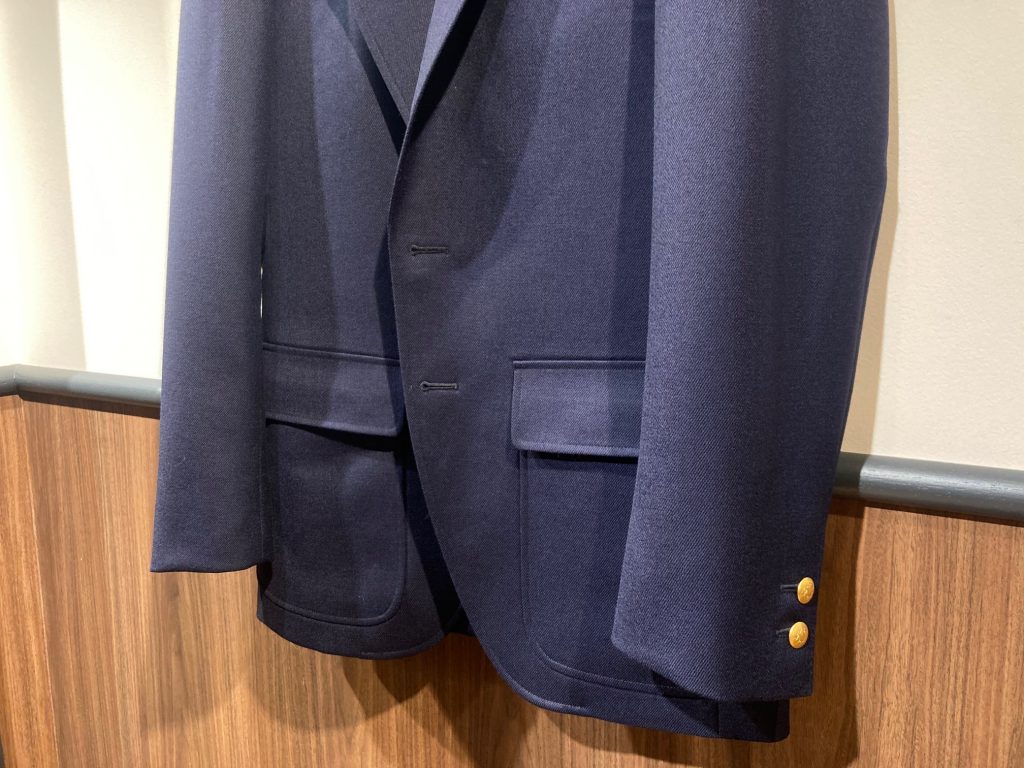 3つボタン段返り、腰パッチポケット、本縫いステッチ、ゴールドのメタルボタン・・・・