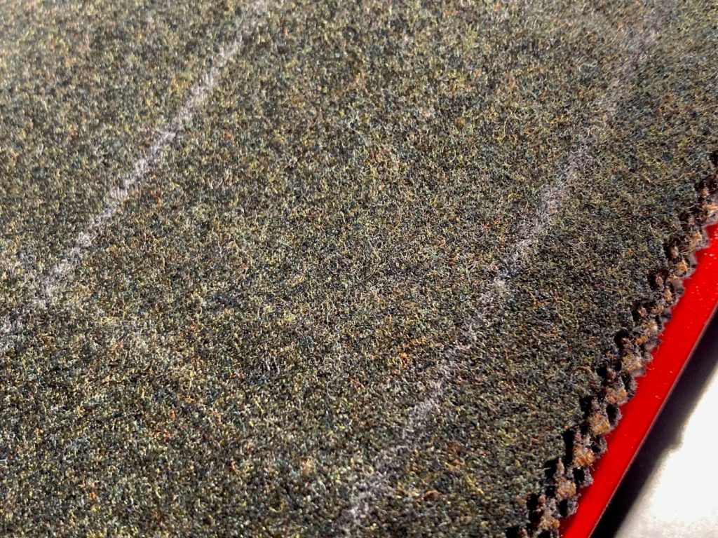 生地をよく見るとグリーン以外のブラウン、レッド、イエロー、ネイビーなどの繊維で織りあげられているため独特の暖かみ、奥行きのある生地感です。
