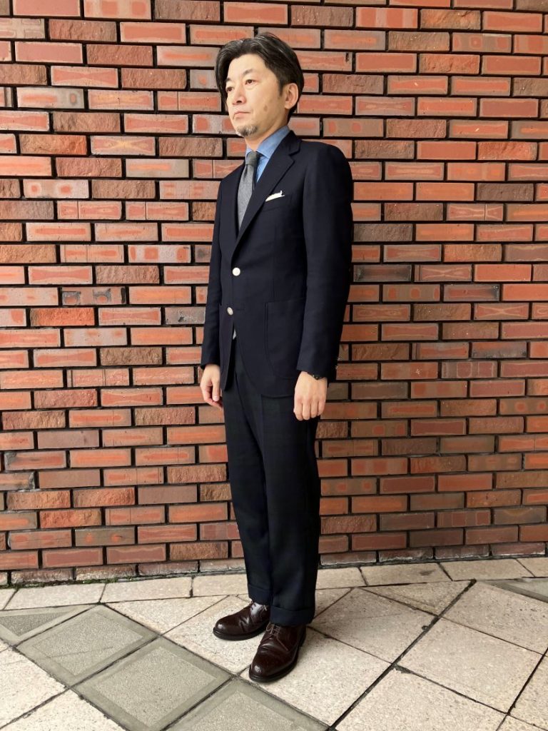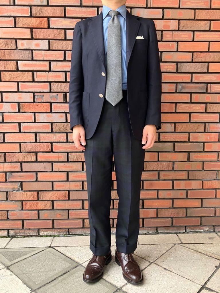 コーディネートも、トップはネイビーブレザー(以前ブログにてご紹介したブレザー)にしていますが、インナーはダンガリーシャツにウールソリッドタイ。シューズはブラウンのウィングチップを合わせ制服に見えない様に心掛けました。