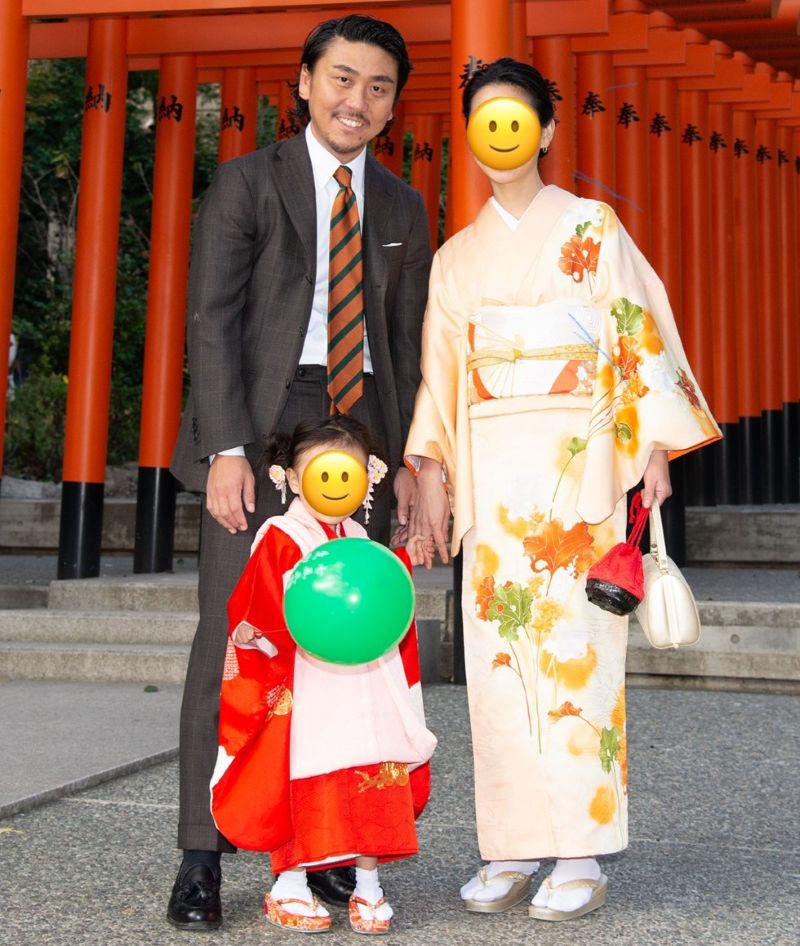 七五三祝いの服装はダークブラウンカラーのスーツ、ホワイトのレギュラーカラーのシャツ、奥様の着物のカラーに合わせたネクタイで統一感を出しています。