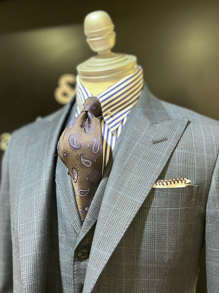 英国らしいグレンプレイドのスーツ、ロンドンストライプのシャツを青色で纏め、茶のペイズリータイでアクセントに