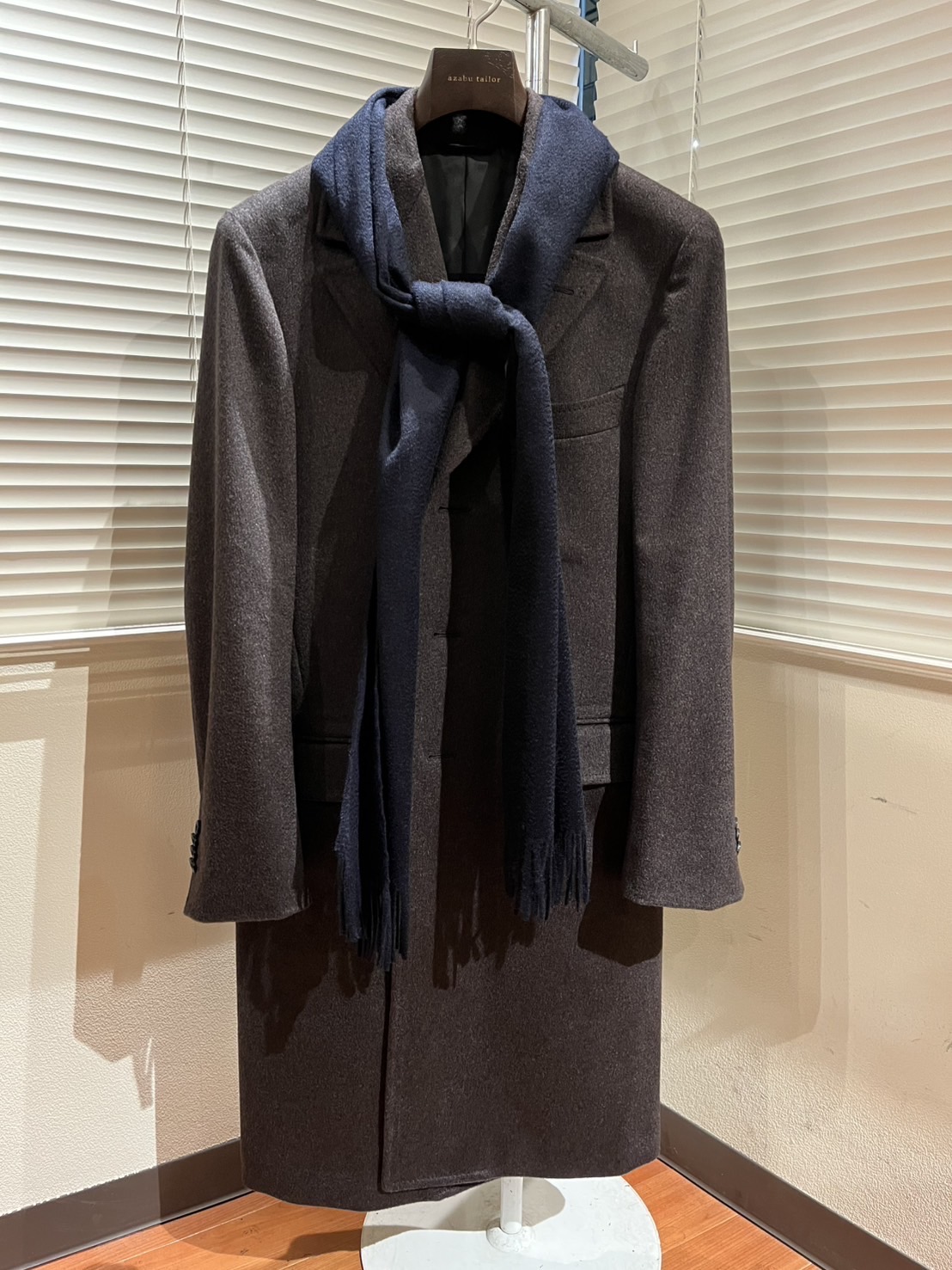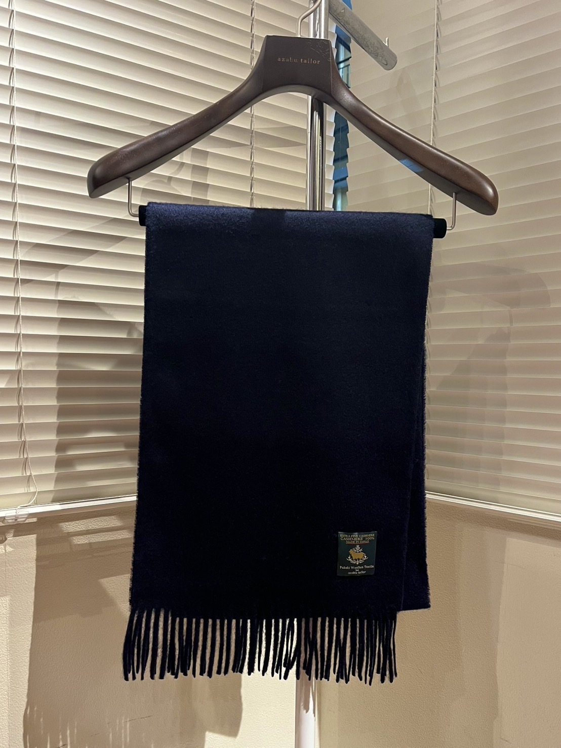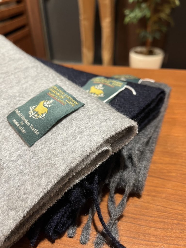 こちら、明治二十年創業の国内老舗毛織物メーカー”深喜毛織株式会社”に依頼し、製造した麻布テーラー別注のカシミヤマフラーでございます。