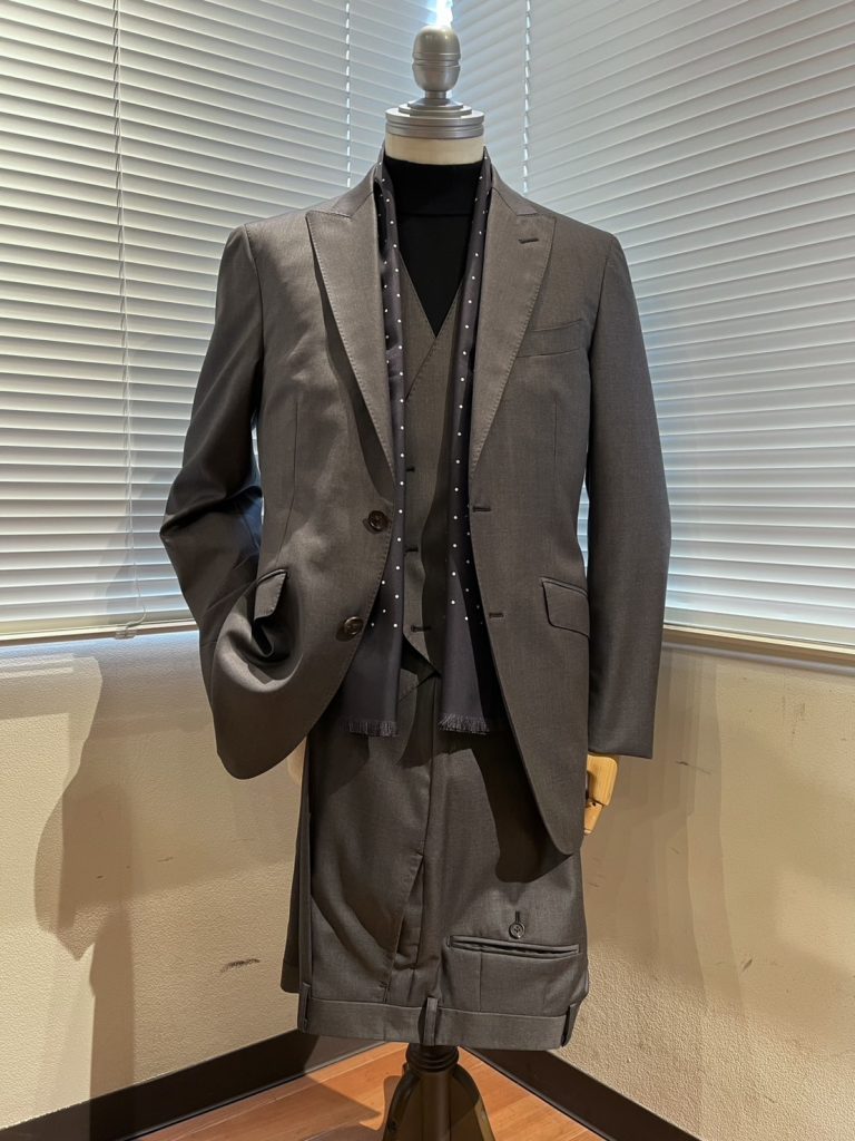 グレーとブラウンのちょうど中間的立ち位置の色味で構成されたこちらのお品物は、グレーの知的な印象とブラウンの温かみを感じられる汎用性の高いスーツに仕上がっております。