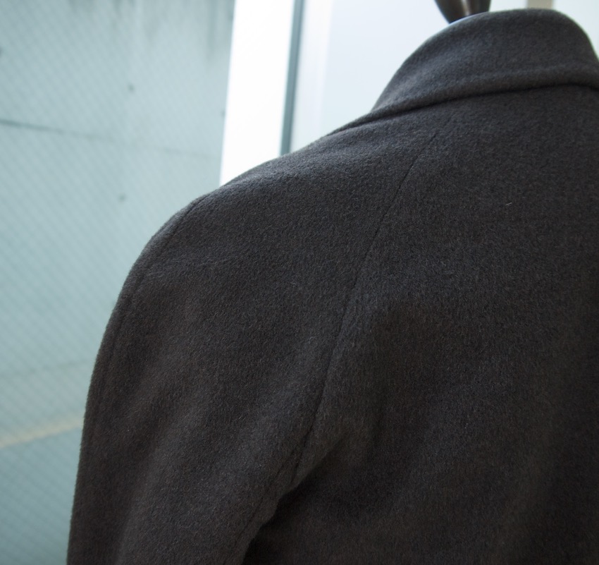 正面はジャケットと同様に見頃と袖を付け合わせたセットインスリーブになっており、後ろはラグランスリーブのデザインです。