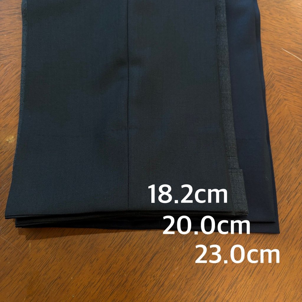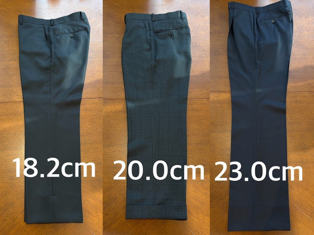100年以上あるスーツの歴史の中で太くなったり細くなったりを繰り返していくのですが、俯瞰で見ると標準的な裾幅は約19~21cmとなります。