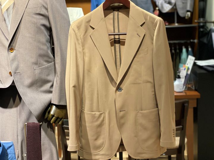 ネイビージャケットはウール×リネン、パンツは洗いのかかった独特なブルーと、各アイテムで素材とトーンを変えている為、無地でも表情が出て、シンプルな組み合わせでも季節感のあるコーディネートがオススメです。