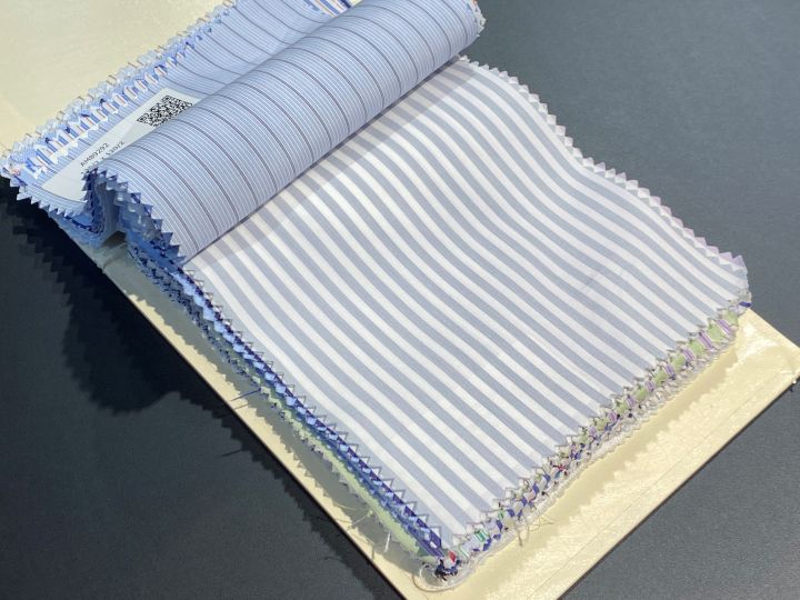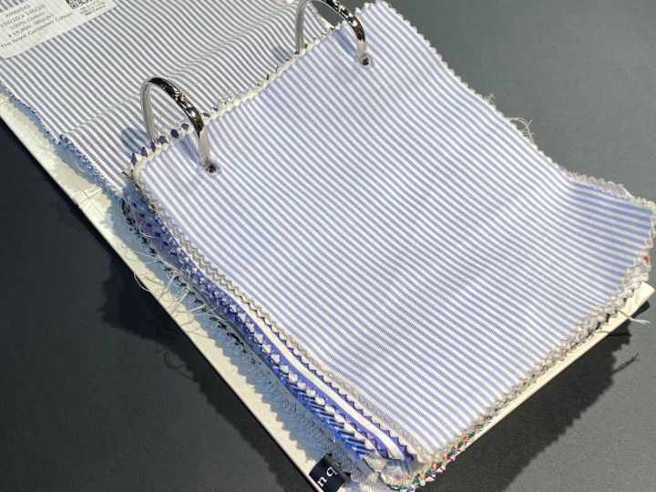 サックスブルー細ストライプ。適当に選びたいけど白では物足りない日にどうぞ。