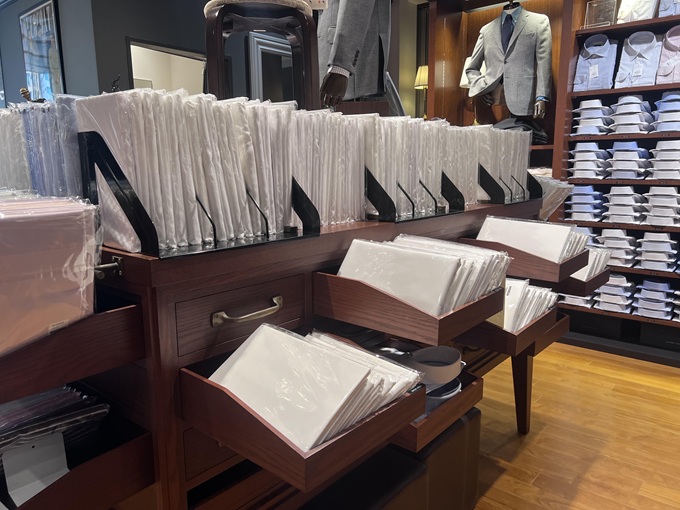 麻布テーラーのシャツフェアでは、普段の店頭ではなかなか目にすることのないデザイン性の高いシャツも豊富に揃っております。