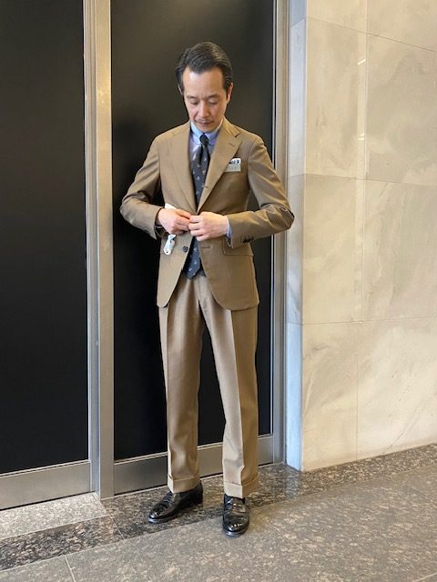 週末は気温も上がり過ごしやすい日になりました。(アウター無の観光客の方も多くお見かけしました)何時もは予約状況や天候と出勤日に応じたコーディネートを決めて、休みの日にアイロン×アイロンをひたすらルーチーンにしていますが、この日は久しぶりにベージュスーツを着用してみました。
