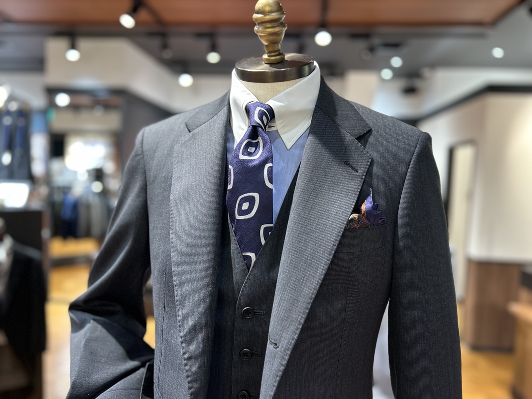 ドレッシーなネイビーに比べると艶感は落ち着きますが、気兼ねなく着用しながらグレー特有の「安心感」を体現できます。個人的にはビジネススーツの本命と言い過ぎでも過言ではありません。