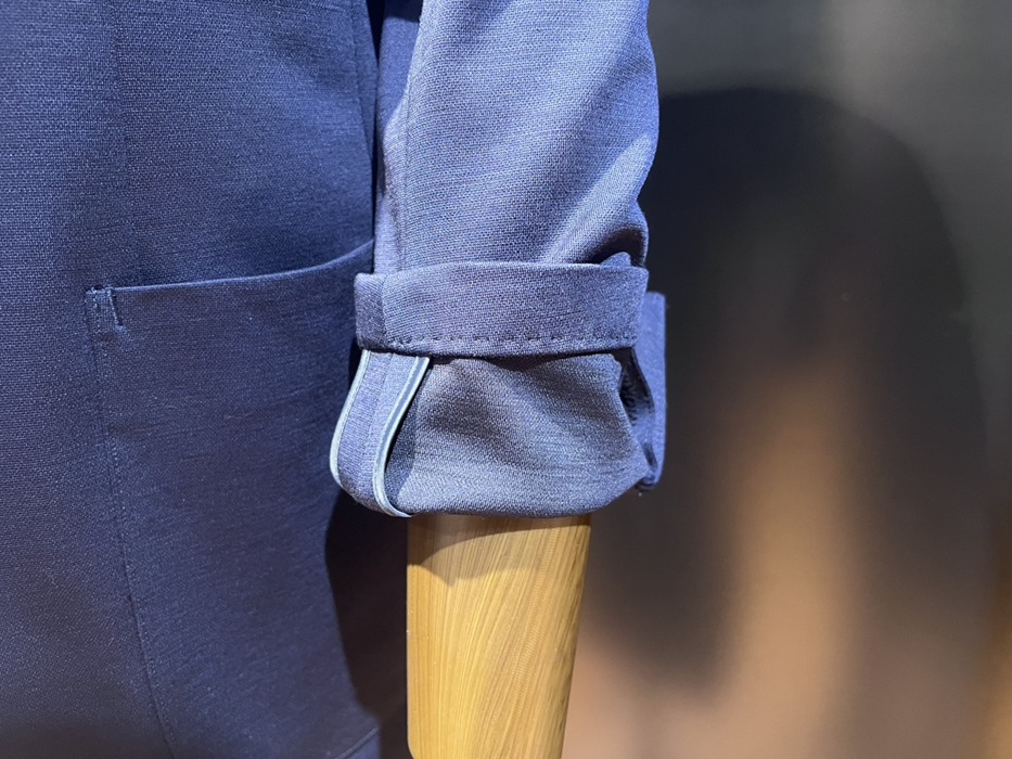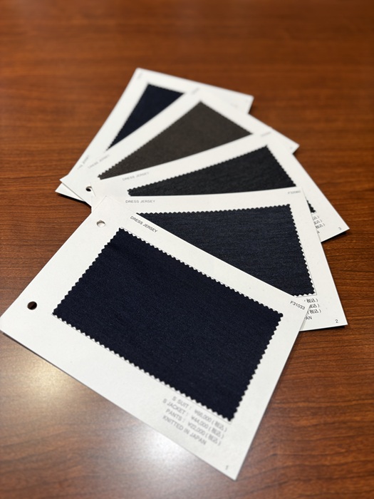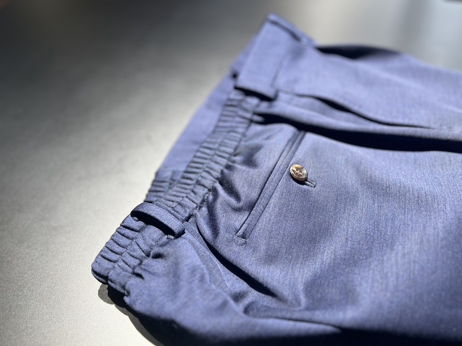 麻布テーラーのジャージー素材が人気の理由は、高いストレッチ性と軽快さの中でテーラードらしい雰囲気も損なわない点と思います。ジャージースーツ¥66,000税込~