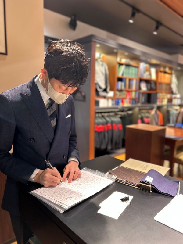 ある営業日の合間に、各人自身の着用したい物を麻布テーラーのブランドらしさをベースに熟考していました。