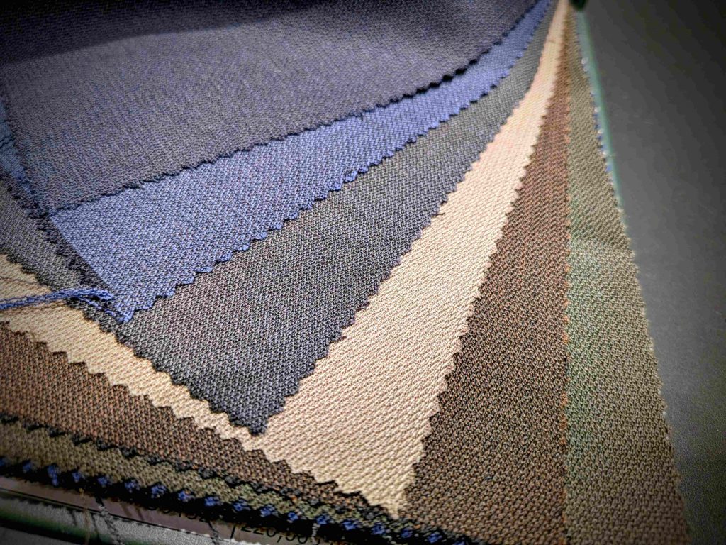 優れた伸縮性としなやかさ、洒脱な表情を併せもつその生地は、カラーバリエーションも豊富です。