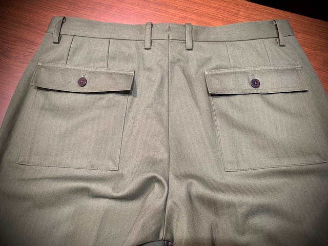 ヒップにもフラップ付きのパッチポケットを採用し、ワークの要素を強く残してあります