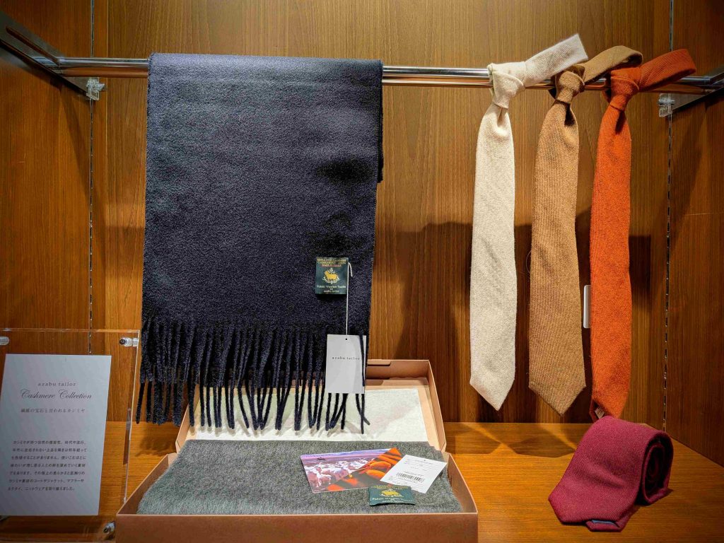 店頭には、カシミヤ100%のマフラーやネクタイもご用意しておりますので