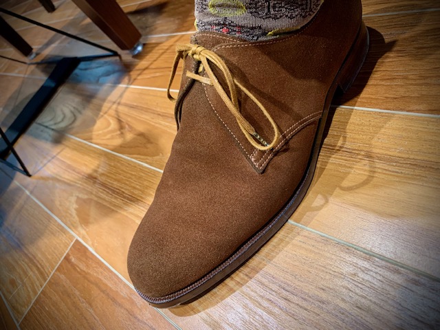 ご本人様いわくこのスエードはジャストサイズで履くことに美学を。足を優しく包み込むアンライニングがが履き心地の良さ、シルエットの美しさに繋がっているのかと。