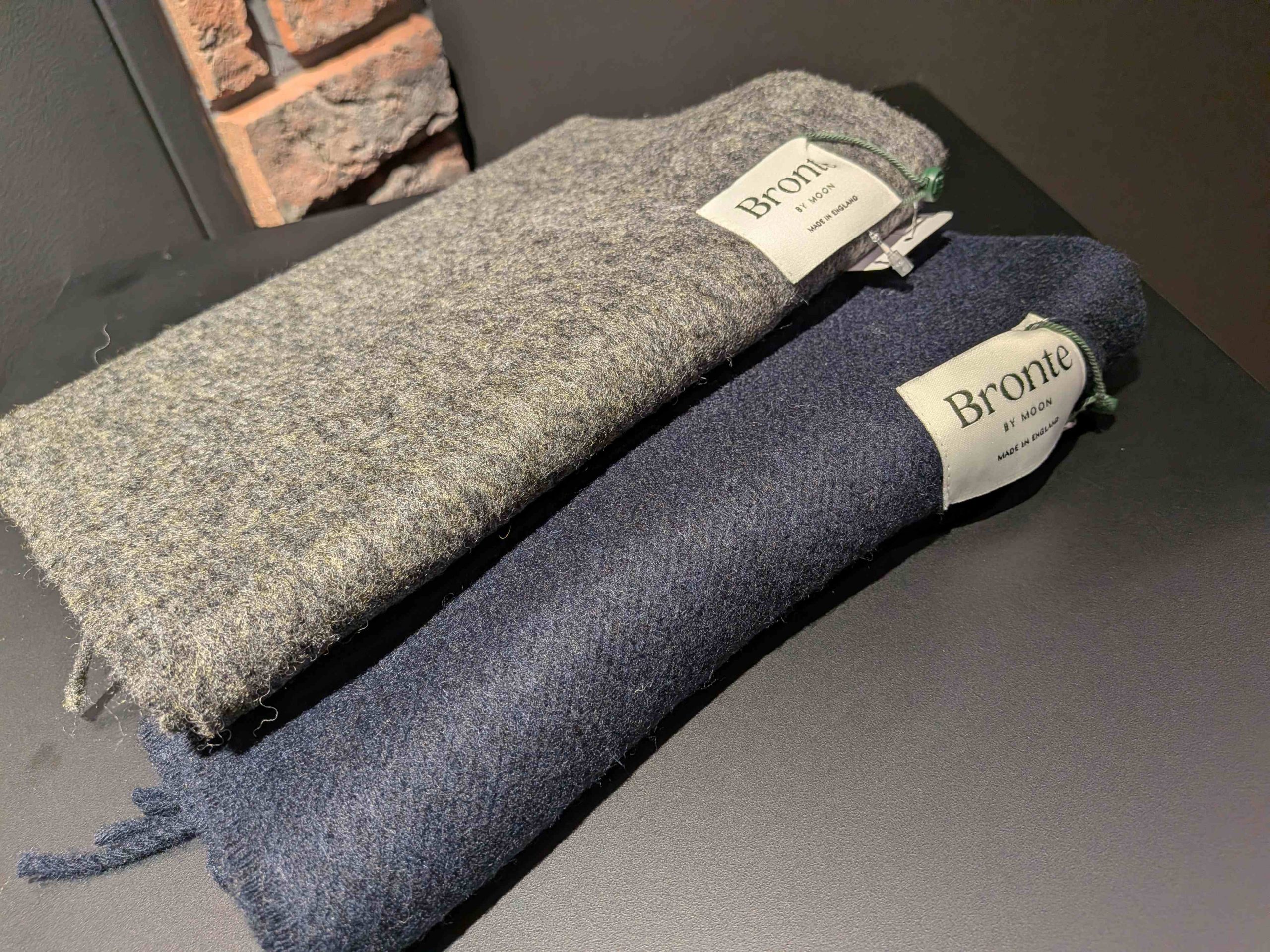 The featured item is a 100% wool scarf from BRONTE by MOON. Made from soft merino wool, it is lightweight, warm, and beautifully textured. With versatile color options and a comfortable width and length, it adds refined elegance to a suit and a relaxed, grown-up feel to casual outfits.