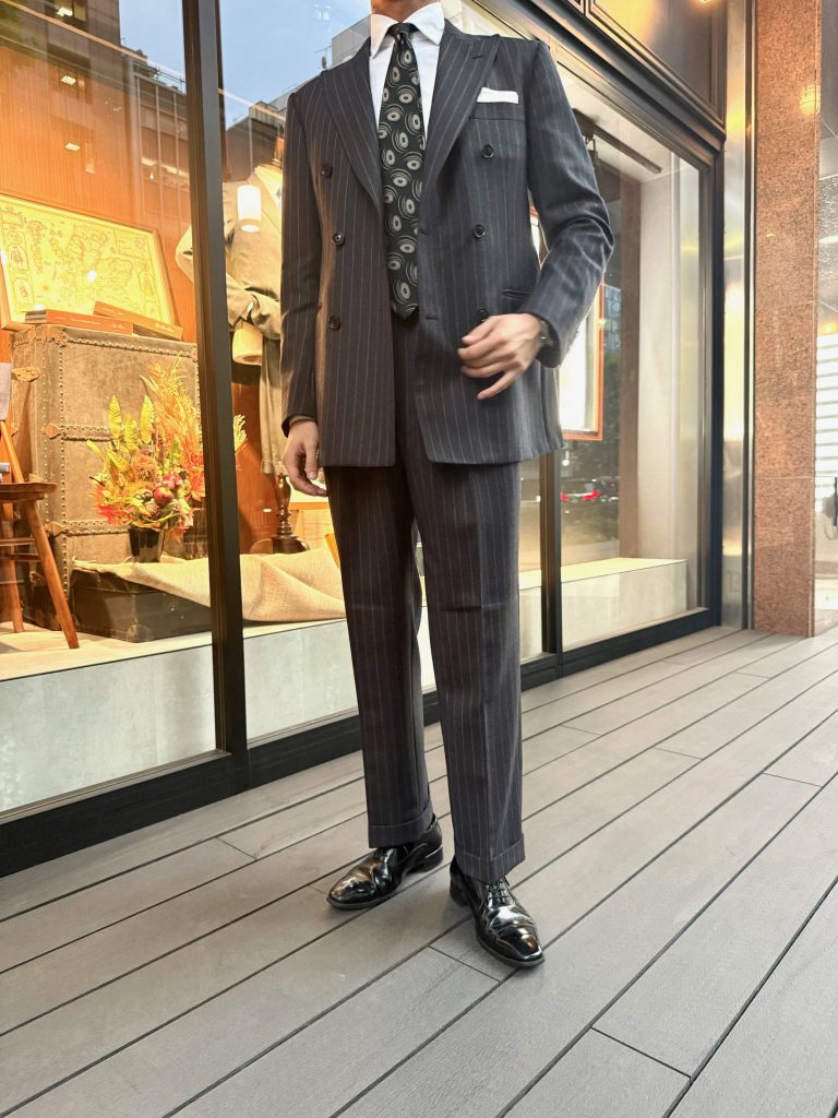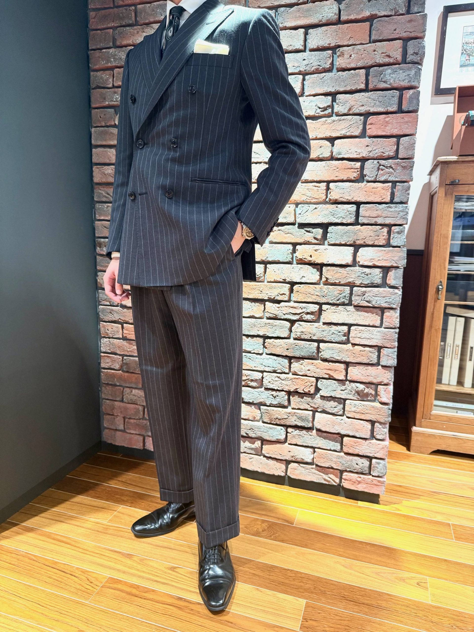 現在こちらの生地は品切れてしまいましたが、チャコールのベースにチョークストライプが施されている実にクラシックな柄となっており、今回はダブルブレステッドで仕立ててみました。