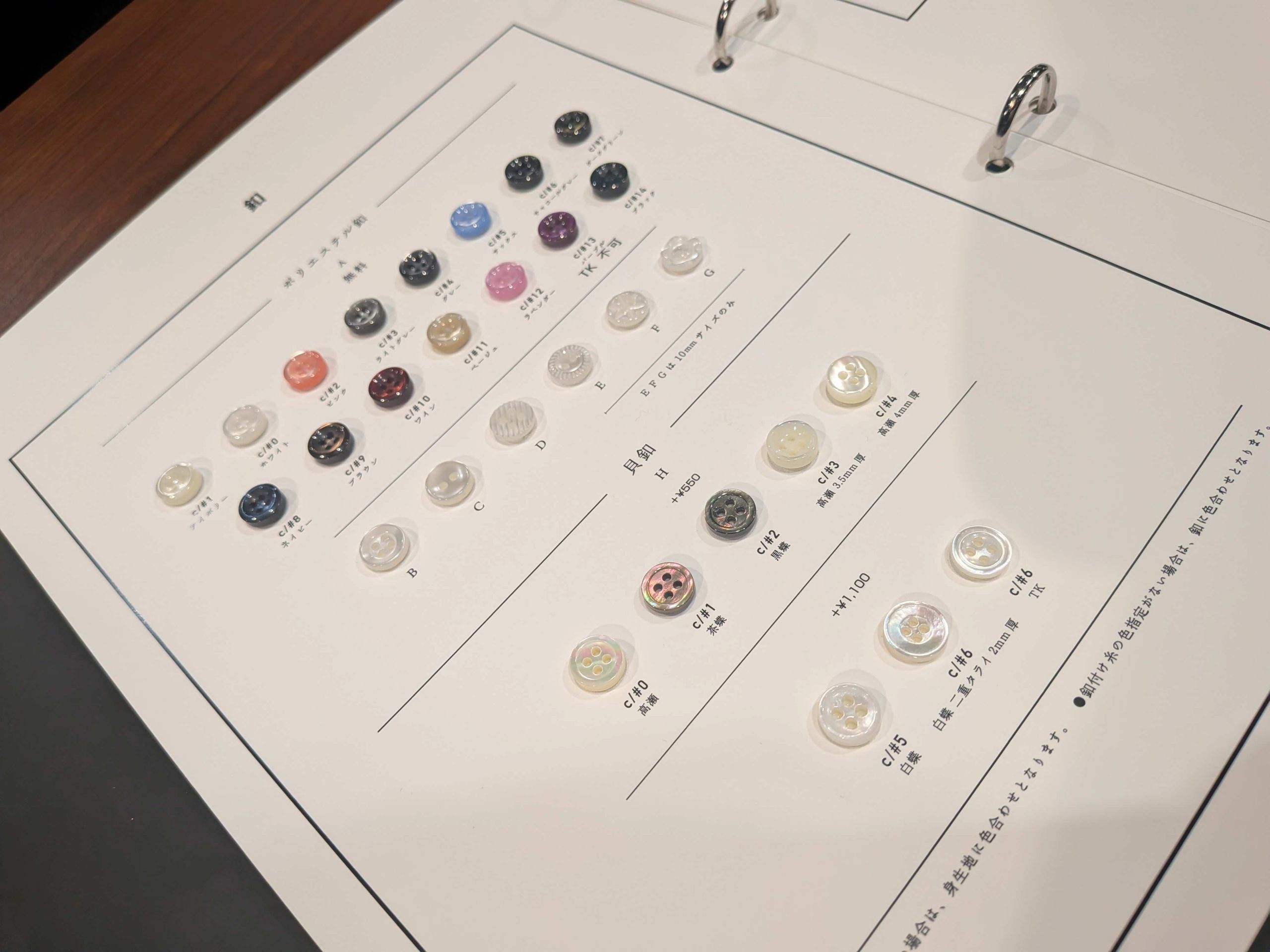 釦もいろいろありますが、貝釦を選びました!オプションで刺繍(¥550)も可能ですが、今回はなしに。