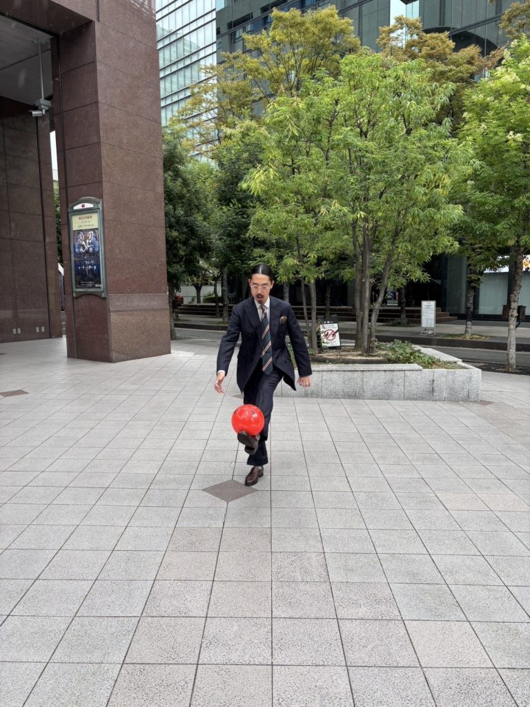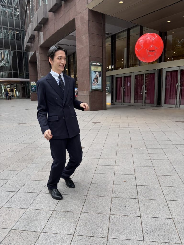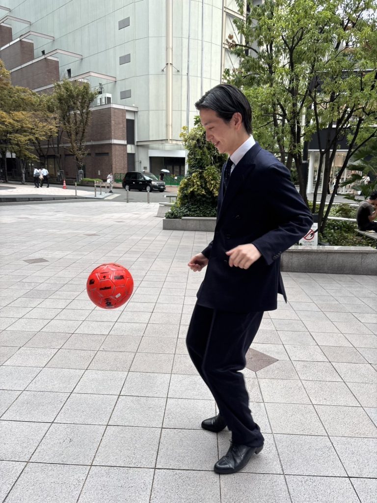 そんな快適さを皆様にお伝えする為、今回スタッフの矢引にジャージスーツを着用しながらサッカーのリフティングにチャレンジしてもらいました。