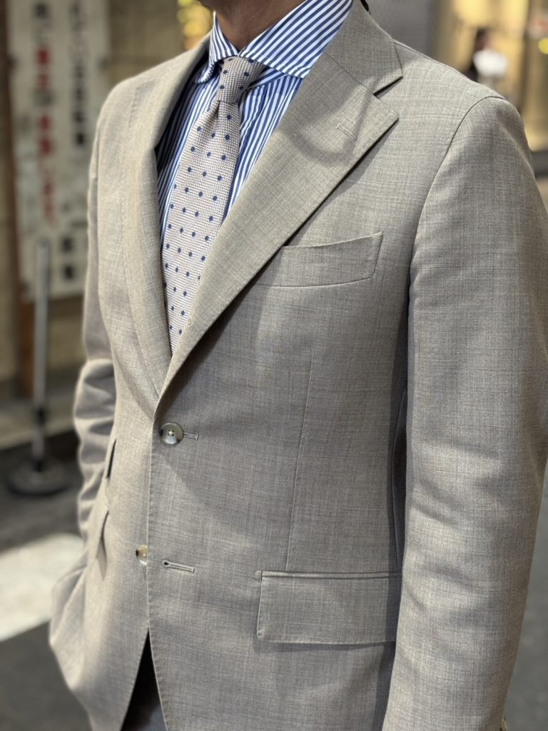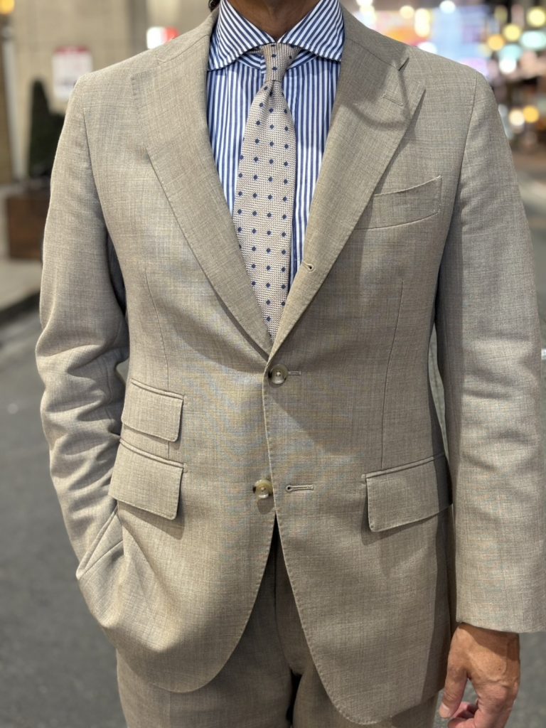 こちらのスーツは春夏のトロピカルの生地で仕立てておりますが、秋冬もエクリュやブラウンカラーは人気がございます。