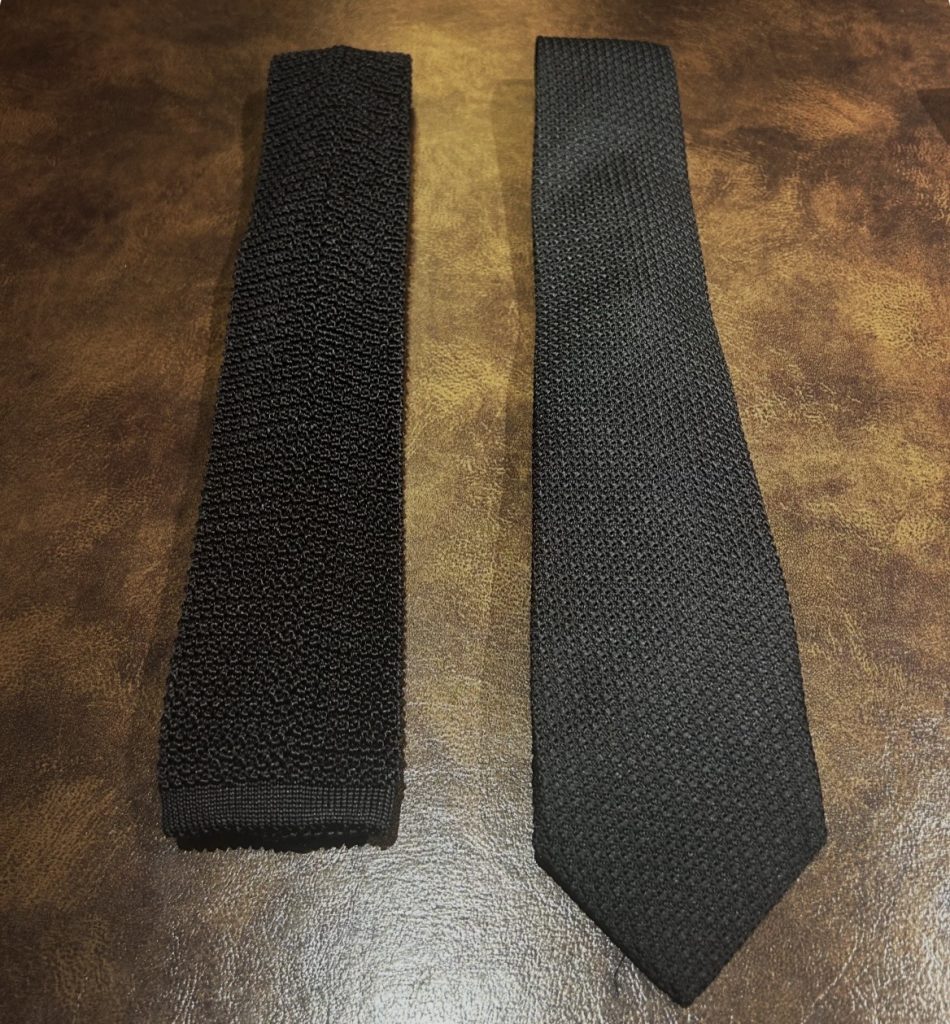 ニットタイ(左)はカジュアルスタイルに使いやすい素材とシルエットですが、