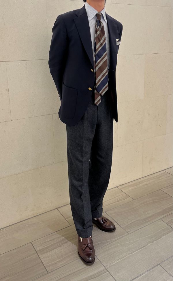 スラックスをフランネル素材にし、ネクタイやローファーは温かみのあるブラウンをチョイス。
