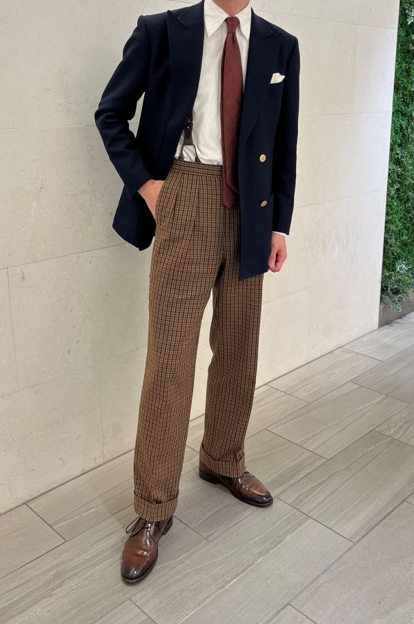 ワイドなピークドラペルでドレッシーな印象を、カジュアルなガンクラブスラックスで遊び心も演出。
