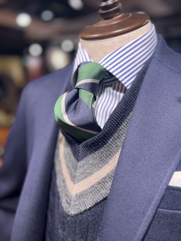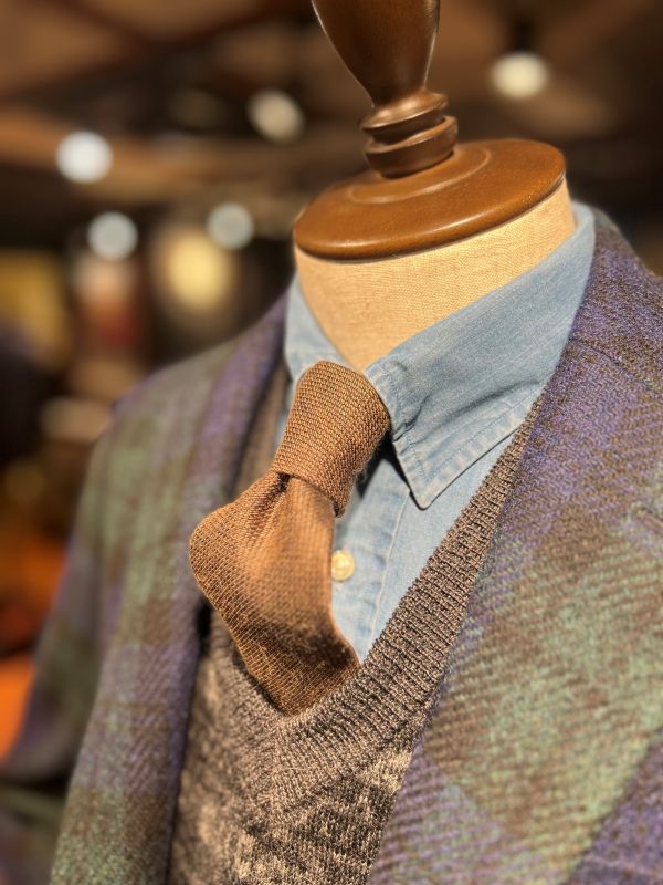 定番の使い方ですが、ブリティッシュウールを使用し、シワにもなりにくく機能性もあるチルデンニットのベストです。