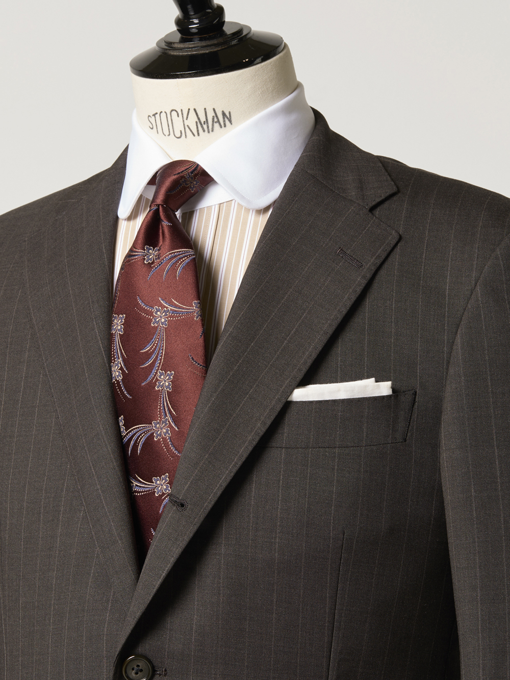 尾州産ウール100%を使用。しなやかな風合いと自然な光沢が、春夏でも品格ある佇まいを演出します。身体の動きに沿う弾力が立体的なシルエットを支え、軽やかでありながら構築美を損ないません。ブラウン無地はセットアップ対応で着回しも自在です。◼︎オーダースーツ ¥49,500【A52908】+水牛釦¥3,850