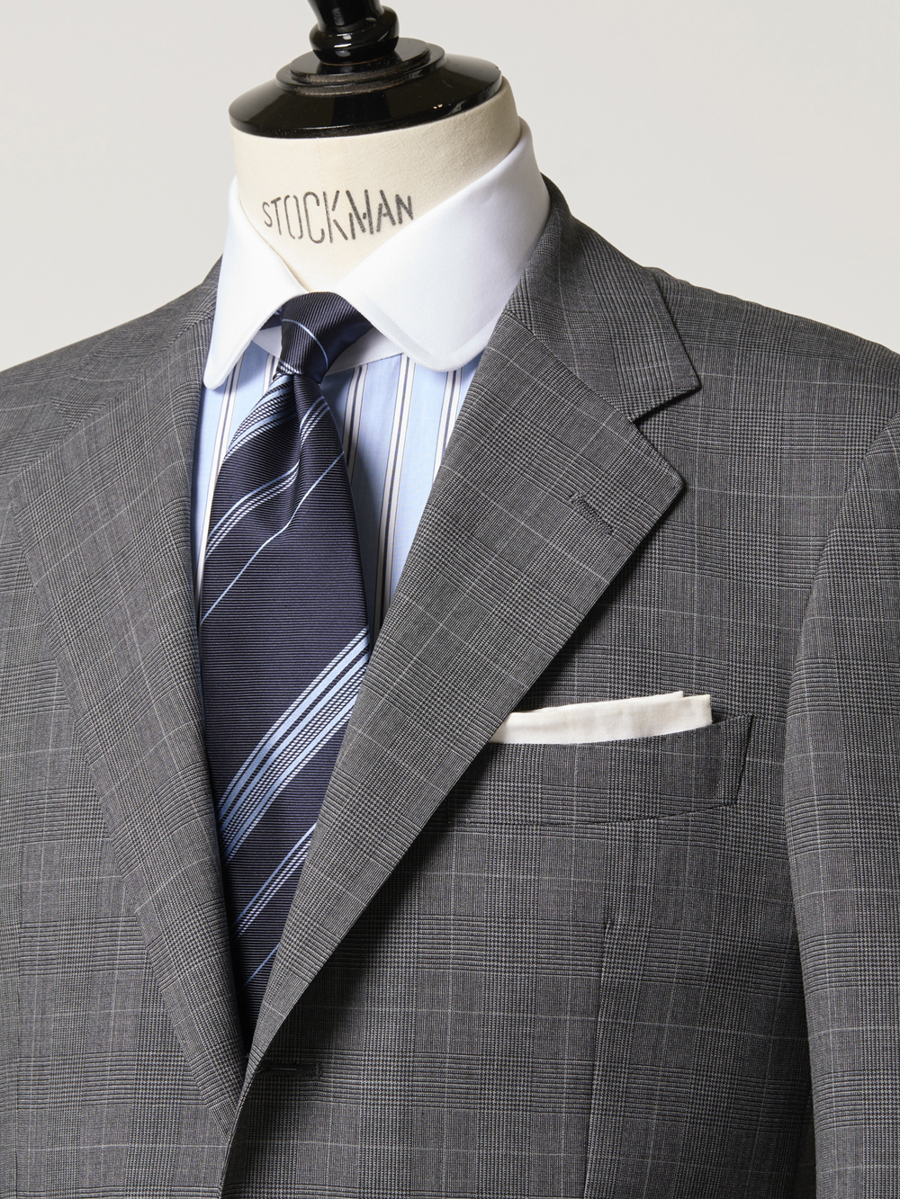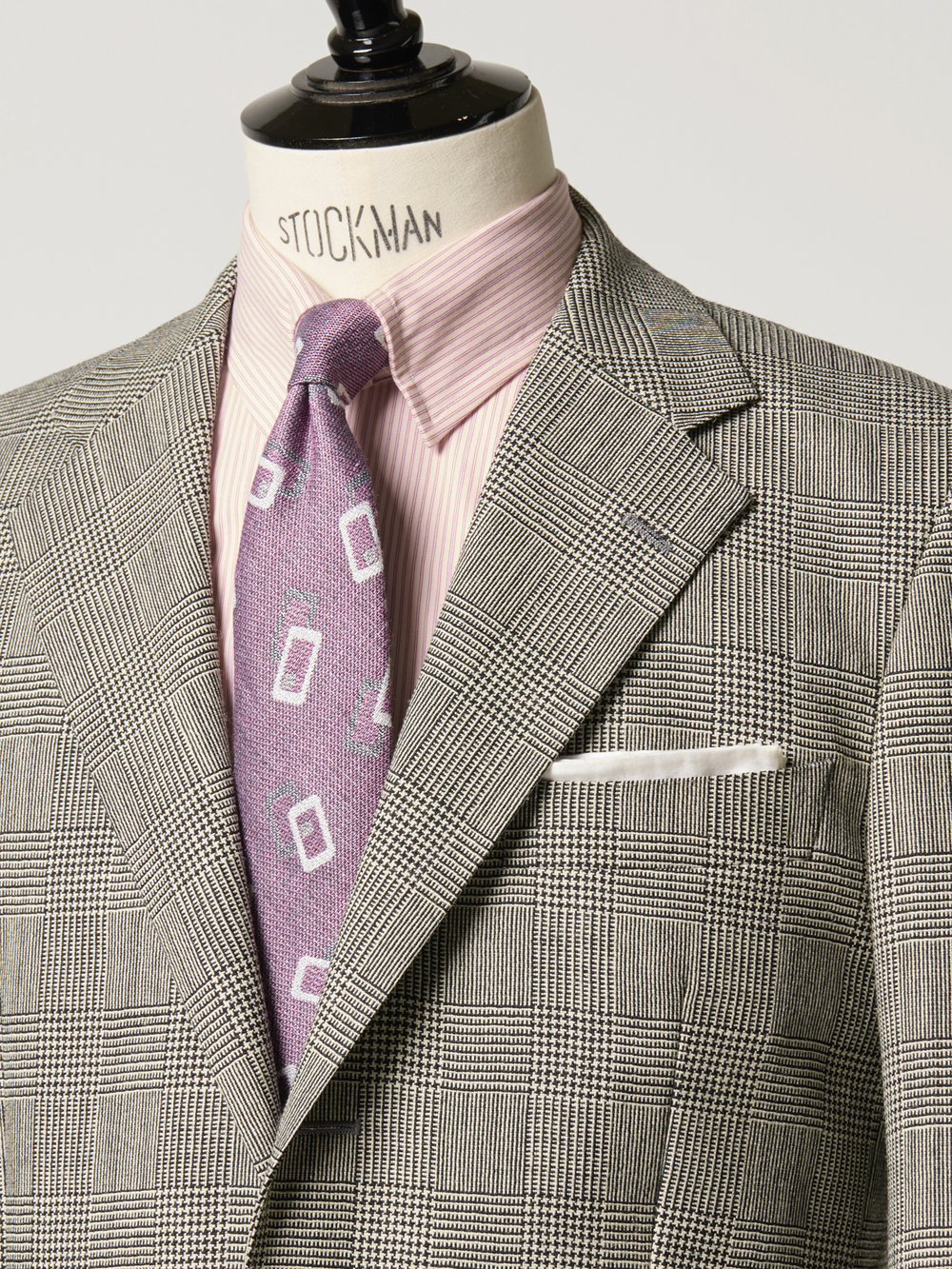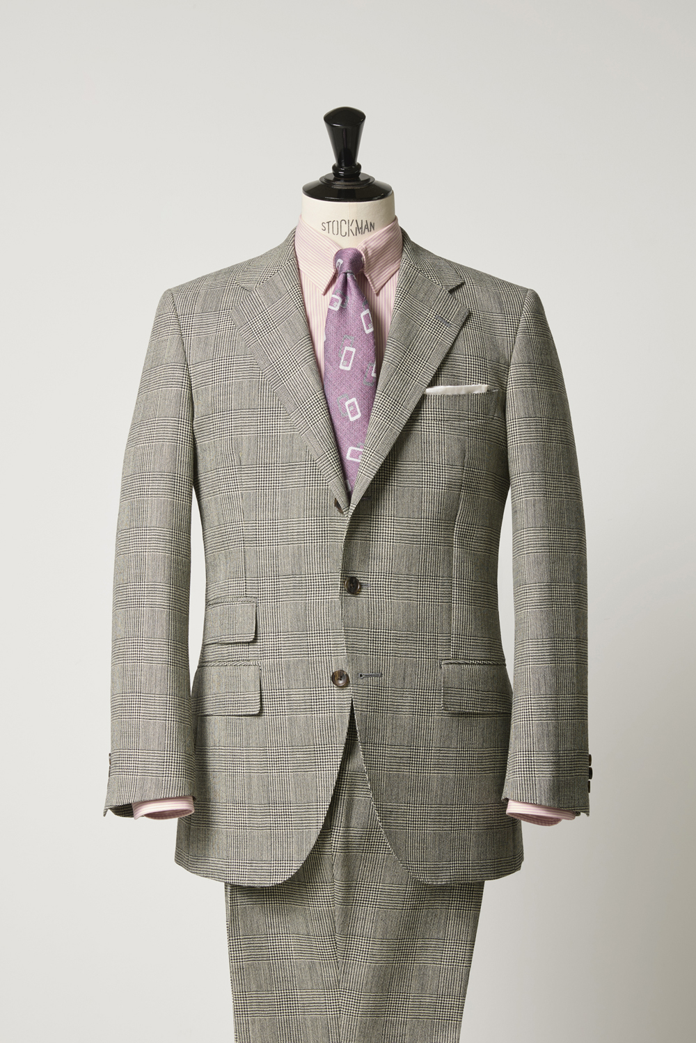 麻布テーラー別注素材のMARING & EVANSのJACOBITE。白黒グレンチェックが持つ伝統的な存在感とハリコシが立体的なシルエットを際立たせます。重厚さを保ちながらも春夏らしい軽やかさを実現。クラシックを現代的に着こなすための一着です。◼︎オーダースーツ ¥88,000【E62694】+水牛釦¥3,850
