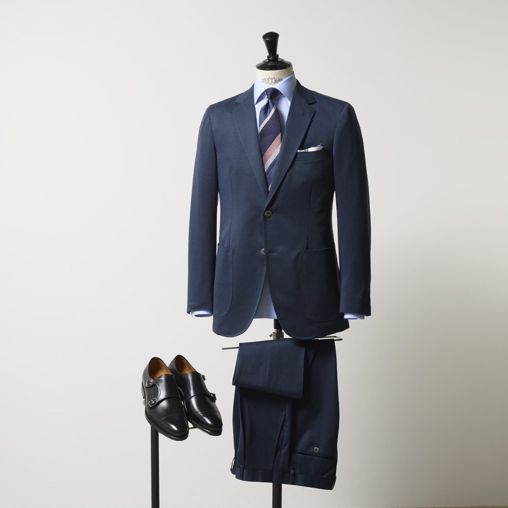 紺無地でも独特の表情があるため、堅くなりすぎないのが特徴。パッチポケット仕様にすることで、ジャケット単品でも着回せます。オーダージャージースーツ¥66,000+水牛釦¥3,850【F62130】