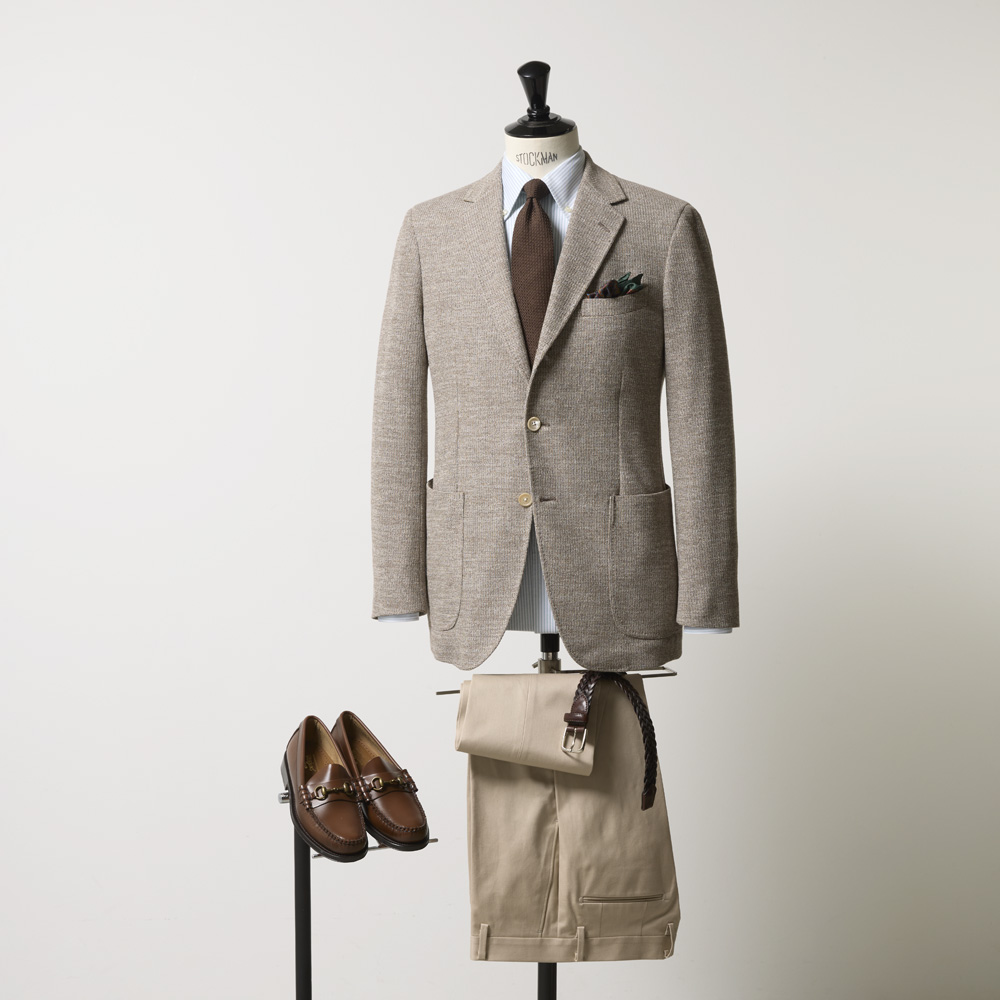 立体構造により軽量で、通気性・吸水性・速乾性に優れた夏向け素材。リネン混ならではの豊かな表情も魅力です。防シワ性とストレッチ性を備えたベージュジャケット。上品な組織感の中に程よいラフさを持ち、大人の余裕を演出します。オーダージャージージャケット¥44,000+貝釦¥3,850【HONEYCOMB LIKE JERSEY F62140】