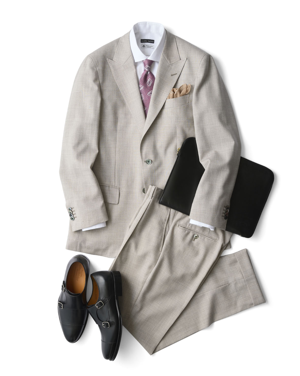 麻布テーラーでは「生地」「仕立て」「デザイン」「釦」の組み合わせによって、お客様一人ひとりに最適な一着をご提案しています。今シーズンのセットアップでは、特に以下の要素にフォーカスしています。
