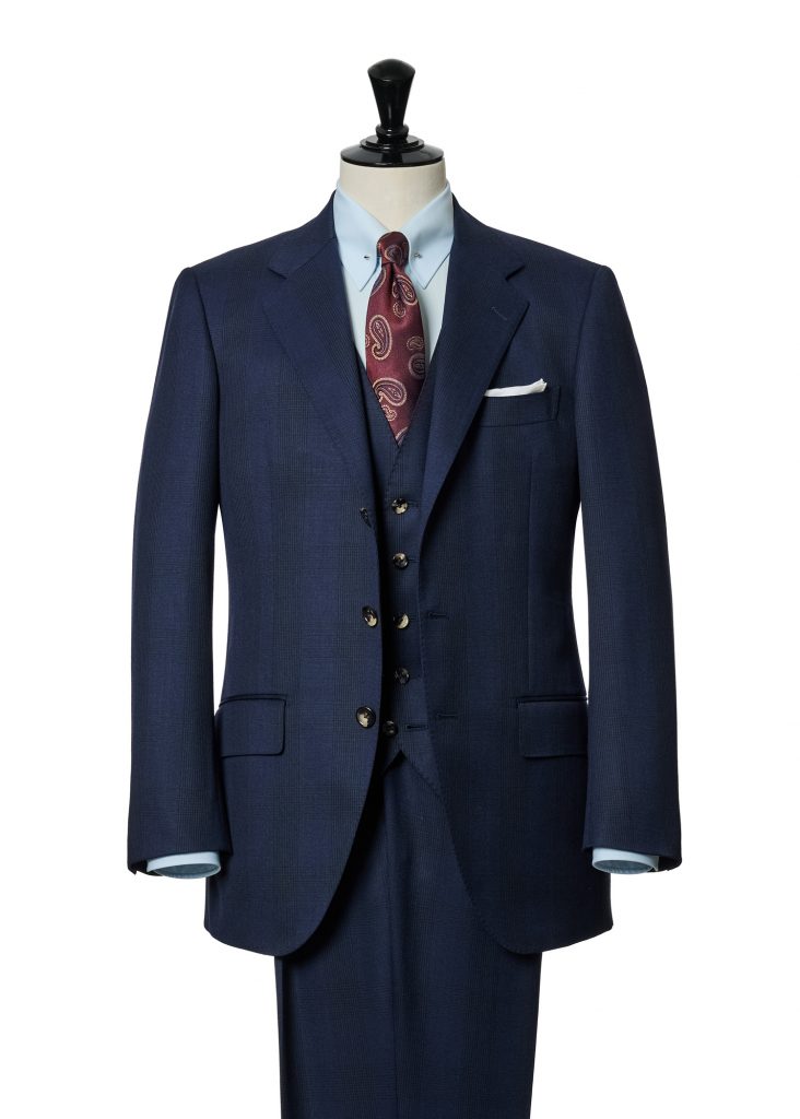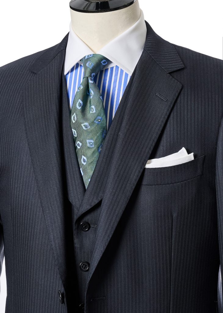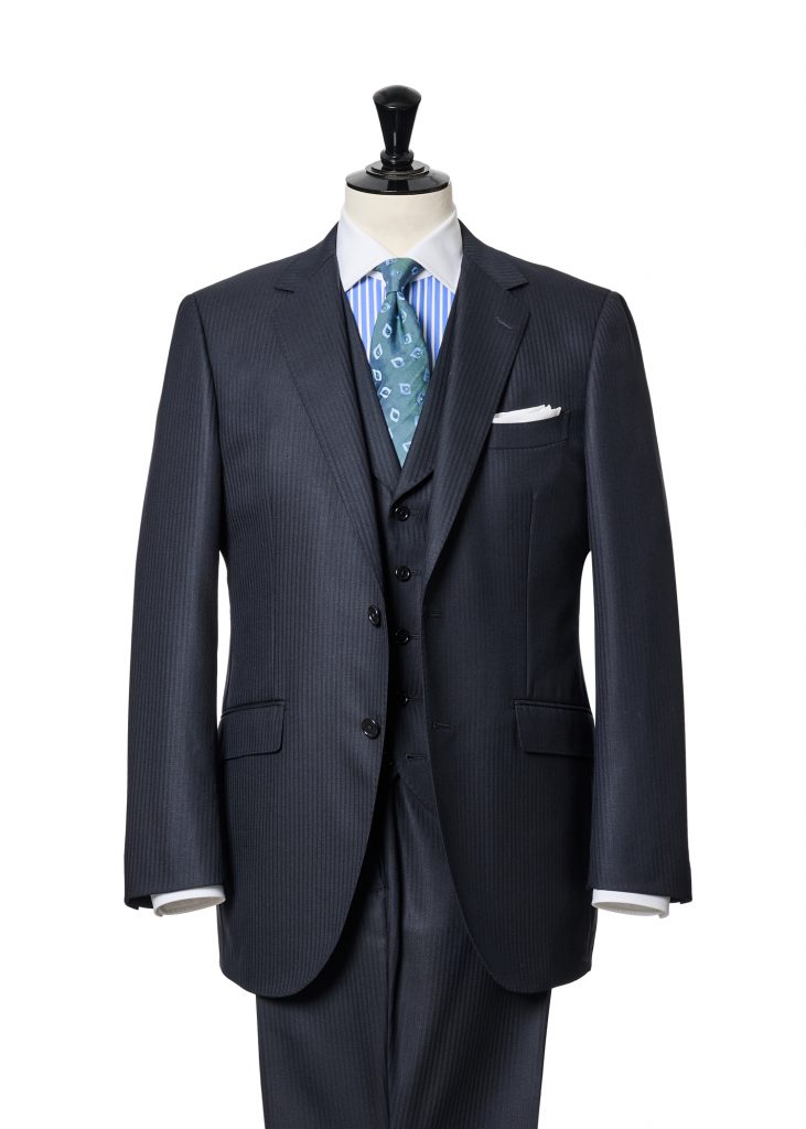 サヴィルロウ番手の糸を高密度に織り上げた、ハリ・コシ・弾力に優れた生地。ロンドンシュランク仕上げによる光沢とさらりとした風合いが、SUPER120’sにも匹敵する高級感を演出。正統派の英国調3ピーススーツとして、ビジネスシーンにふさわしい一着です。◼︎オーダースーツ ¥120,450【E61933・100% WOOL 320g/m】+水牛釦¥3,850