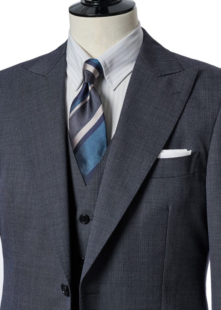 尾州・尾張一宮の名門が手がける、60番双糸の高密度ウール。仕立て映えに優れた320g/m²の生地は、メイド・イン・ジャパンの誇りを感じさせます。ピークドラペルのジャケットと合わせれば、格式あるフォーマルな3ピーススタイルが完成します。◼︎オーダースーツ ¥66,000【A52995・100% WOOL 320g/m】+水牛釦¥3,850