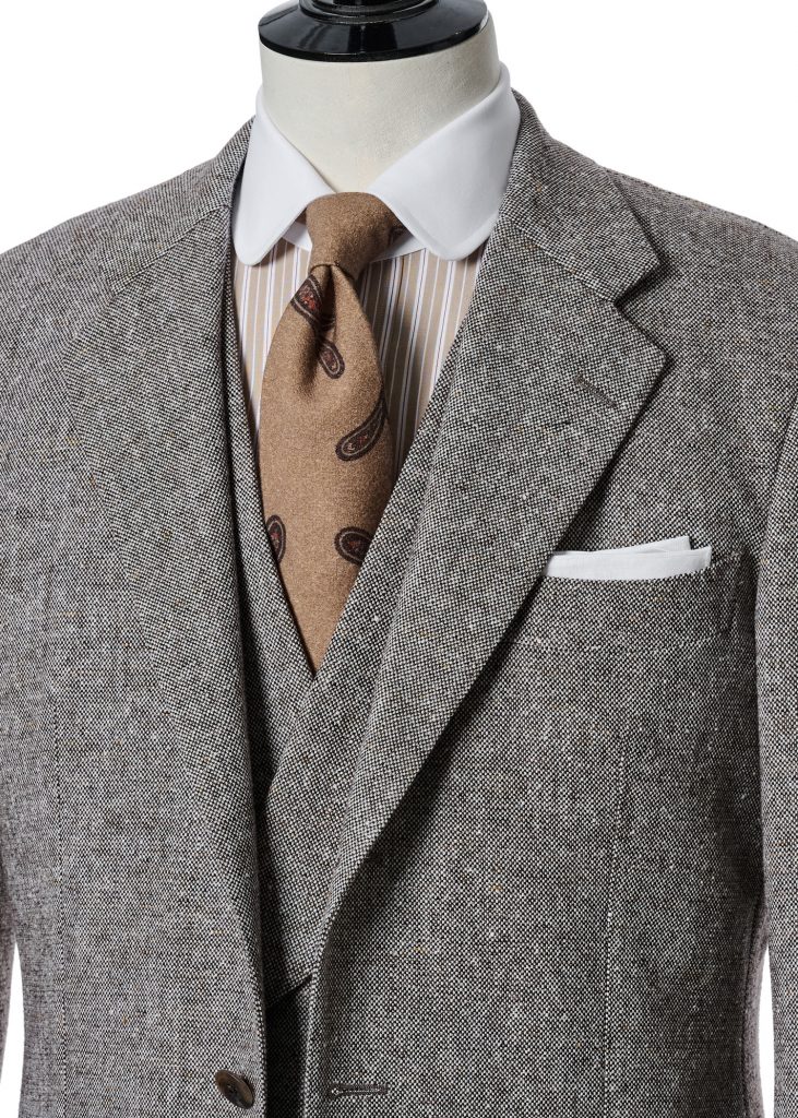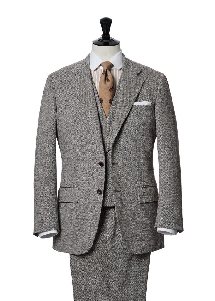 イタリアの名門が手がける、伝統的なドネガルツイードにシルクの光沢とナイロンの強度を加えた混紡素材。重厚感と軽やかさを両立し、アーカイブから着想を得たデザインがビンテージ感とフレッシュさを兼ね備えます。ダブルベストを合わせれば、カントリージェントルマンのような個性派スタイルに。◼︎オーダースーツ ¥1976,450【2515-077 ・80%WOOL / 10%SILK / 10%NYLON 410g/m】+水牛釦¥3,850