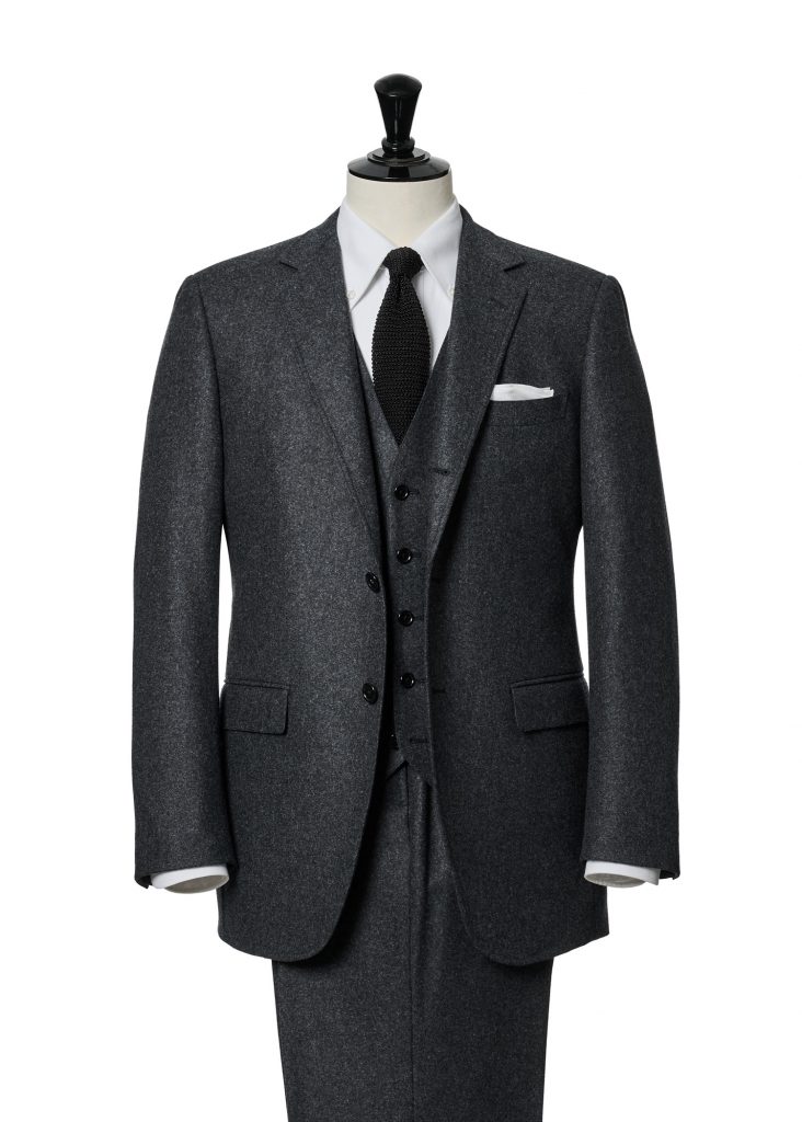 イタリアの老舗ミルによるSuper100’sフランネル。柔らかな膨らみとコシのある手触り、優れたしわ回復力が特徴。脇ダーツなしの細ラペルが、スポーティで軽快なアメリカントラッドスタイルを演出します。◼︎オーダースーツ ¥102,300【B51523・100% WOOL 340g/m】+水牛釦¥3,850