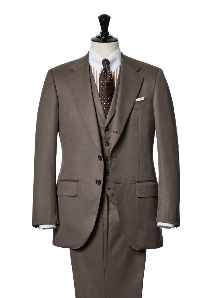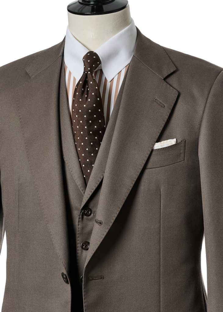 通常のファインメリノよりもさらに細いMAFウールを使用。大きなクリンプによるコシと、白く光沢のある原料が生み出す奥行きのある色合いが特徴です。ワイドラペルと襟付きベストを組み合わせることで、クラシックでありながらモダンな印象に仕上がります。◼︎オーダースーツ ¥94,600【G51815・MAF 120’s TWILL 260–270g/m】+水牛釦¥3,850